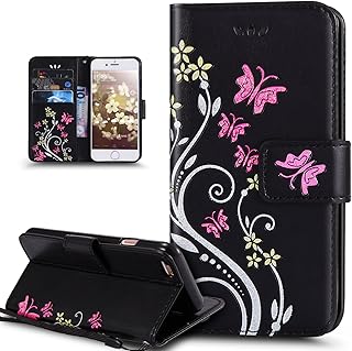 Kompatibel mit iPhone 6S Hülle,iPhone 6 Hülle,Bunte Gemalt Prägung Schmetterlings Blumen PU Lederhülle Flip Hülle Cover Ständer Etui Wallet Tasche Case Schutzhülle für iPhone 6S/6 (4,7 Zoll),Schwarz