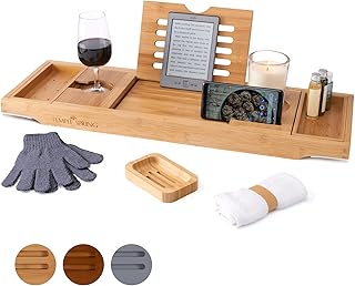 Temple Spring Badewannenablage mit Halter für Kerze, Weinglas, Buch, Tablet, iPad & Telefon Ausziehbare/verstellbare Brücke aus natürlichem Holz als Badewannenablage. Zu 100% aus Bambus (Natürlich)